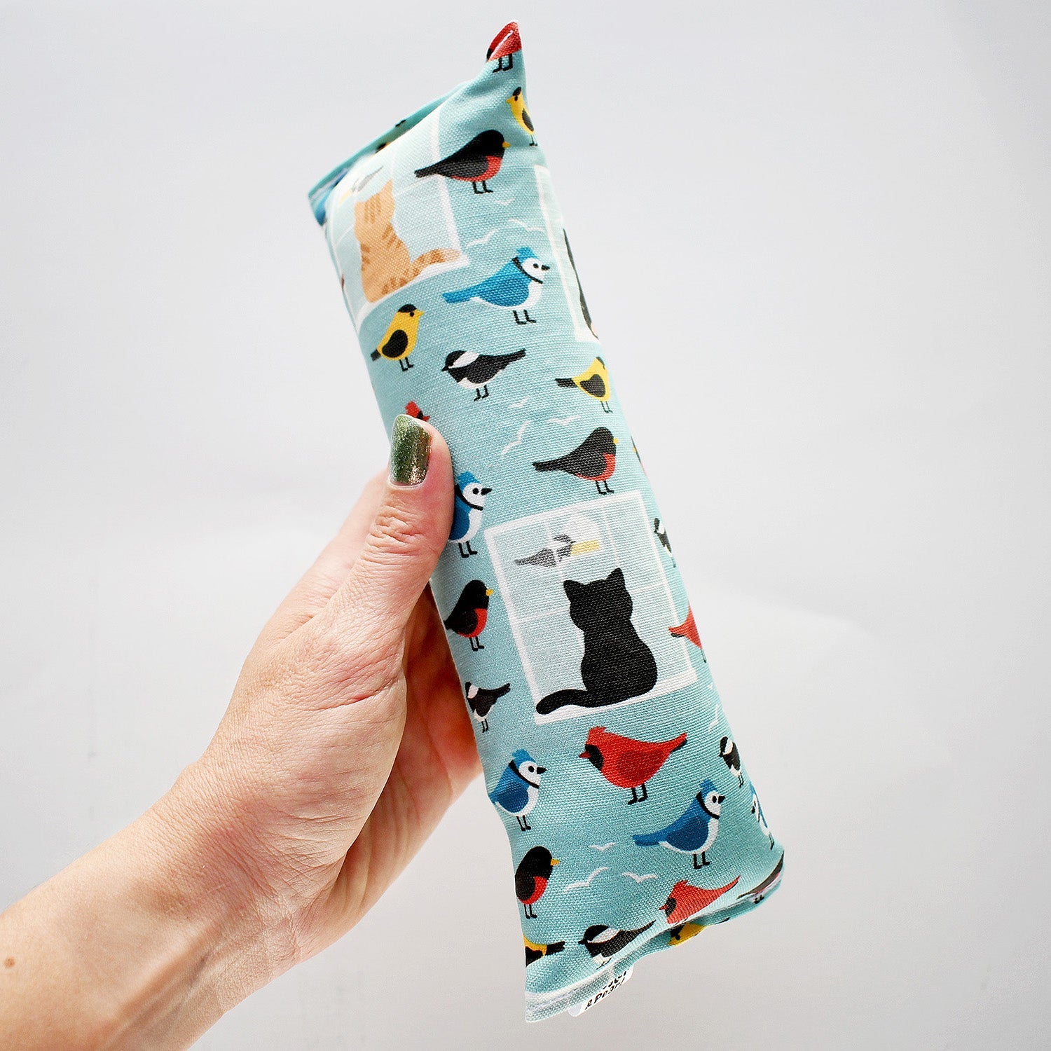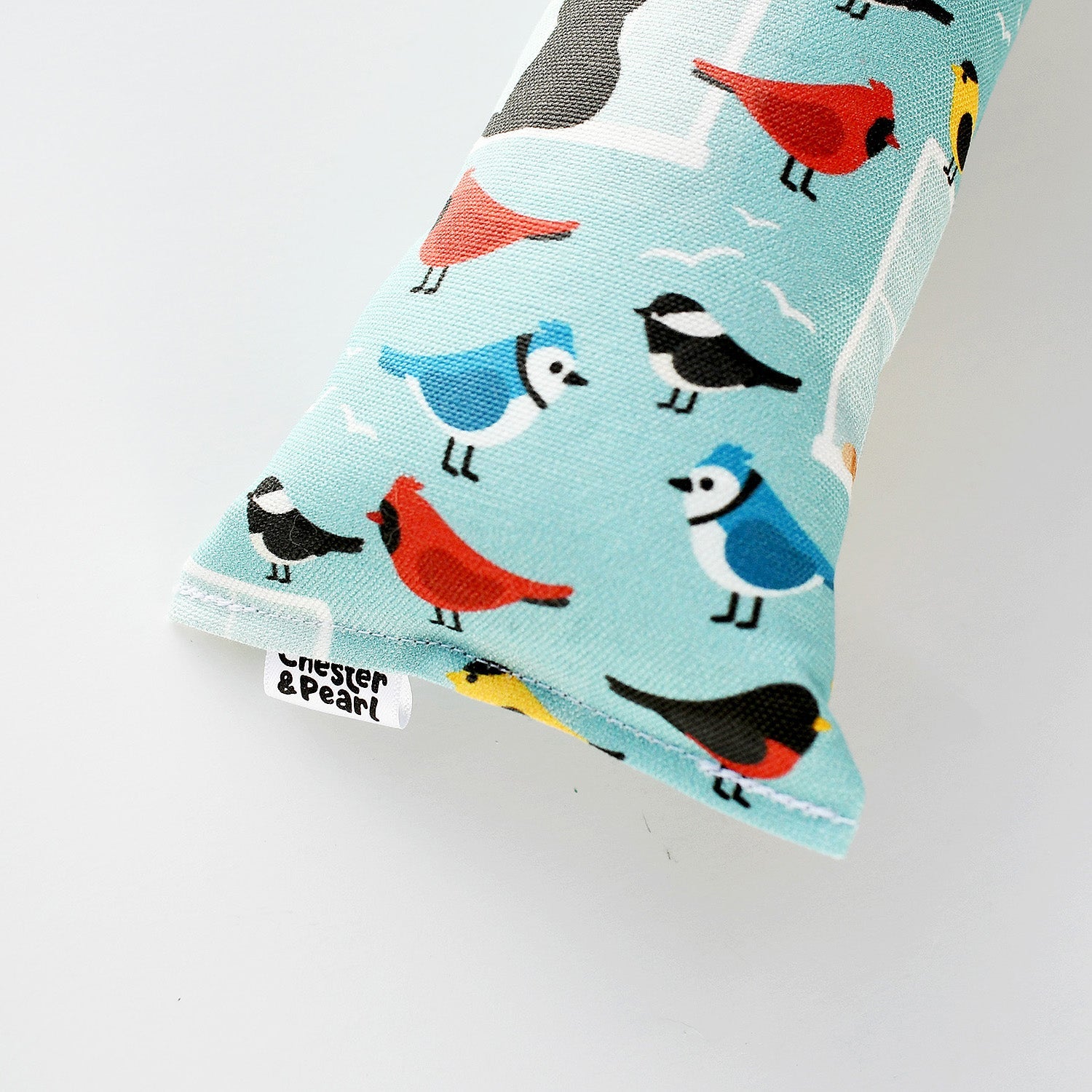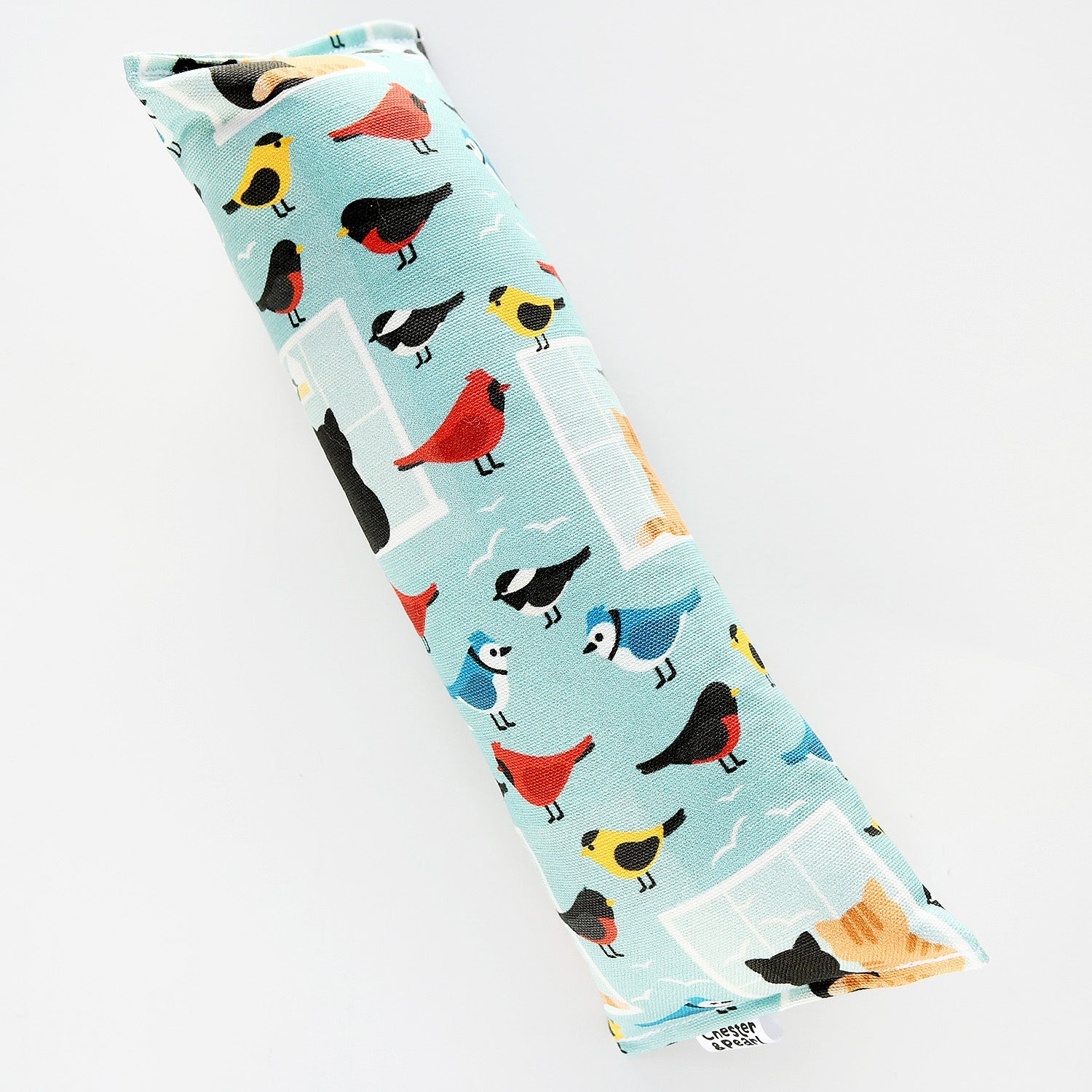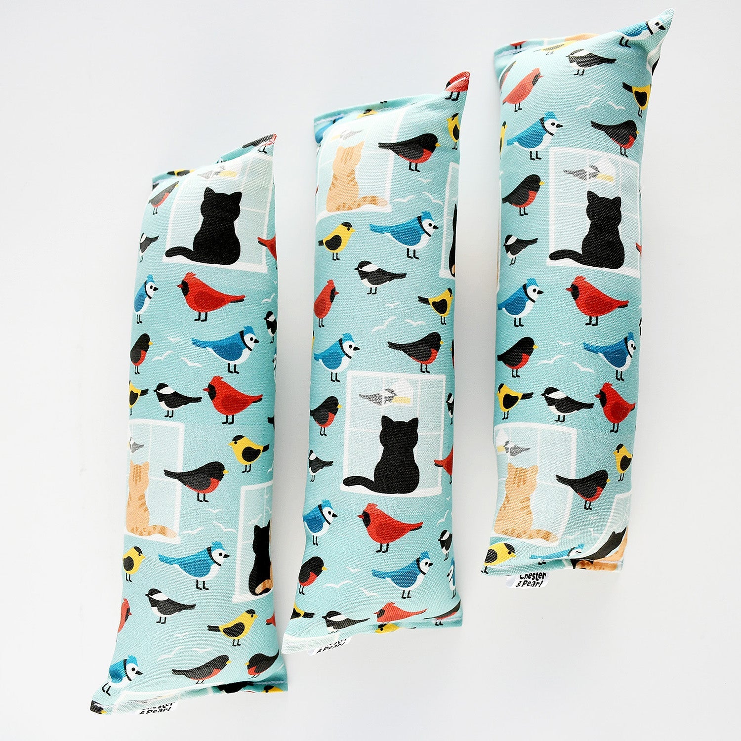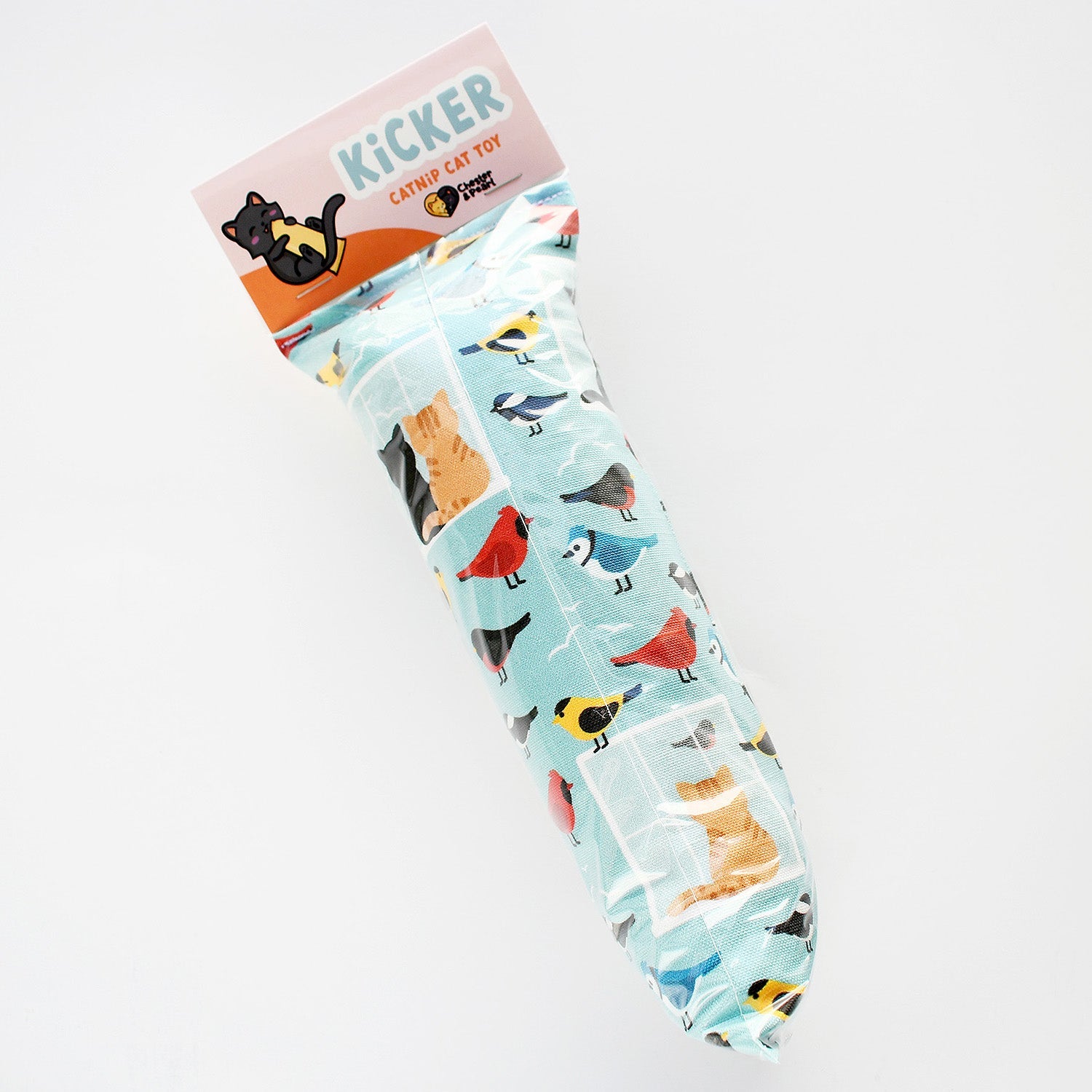 Black and orange kitties inspired by Chester and Pearl eagerly watch the birds just out of reach in this catnip crinkle Kicker toy.