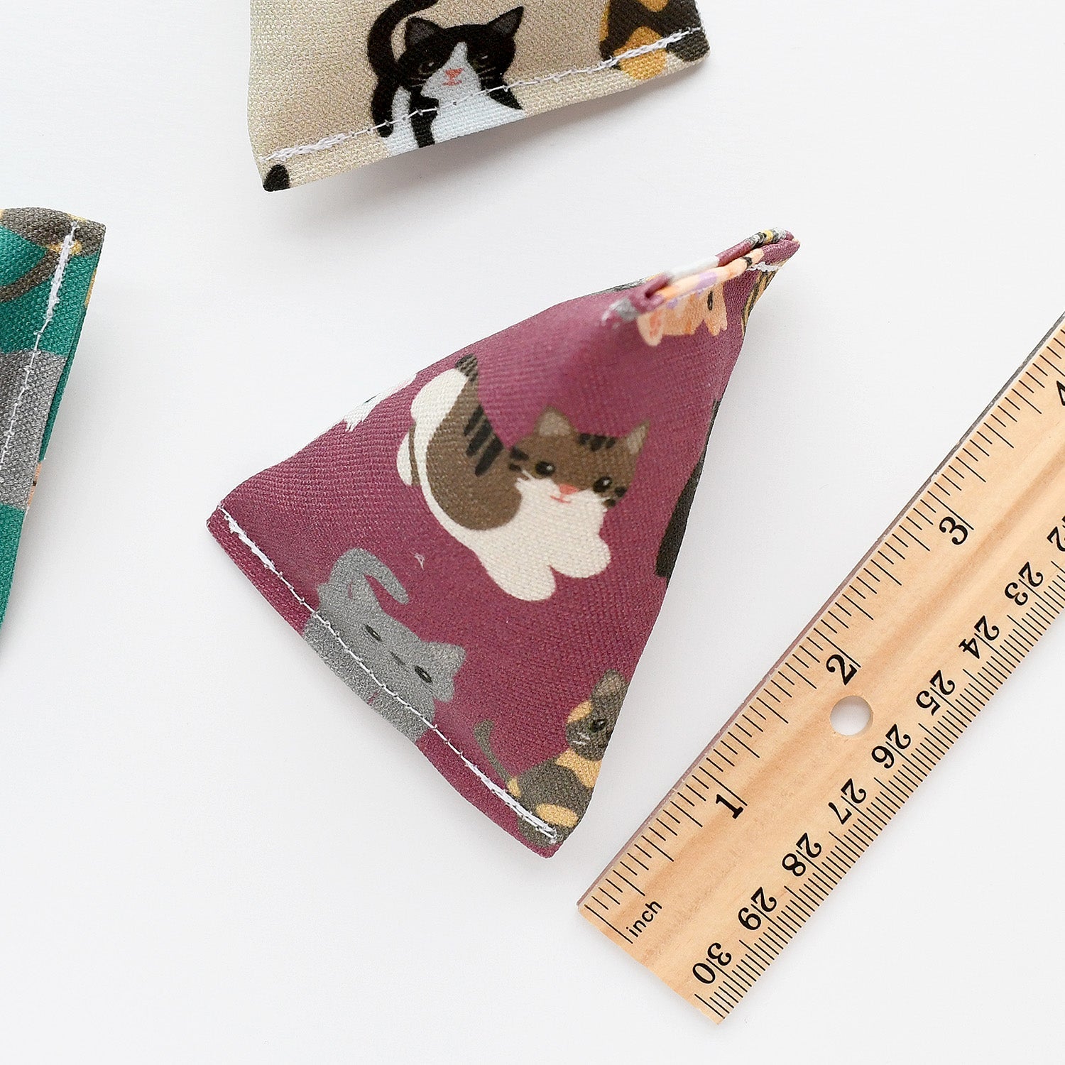 These three Pouncers cat toys - jade, burgundy, and almond - each measure approximately 2.5x4” (6x10cm).